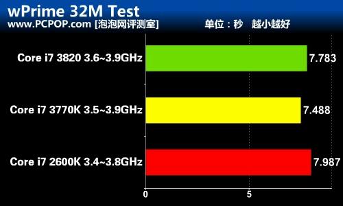 单线程SuperPI的运算中,3820的大容量缓存更具优势,其与3770K的最高睿频频率皆为3.9GHz,而2600K的最高频率则为3.8GHz。而多线程计算中则是3770K小幅领先,其睿频频率与3820相同为3.7GHz,比2600K高100MHz。
