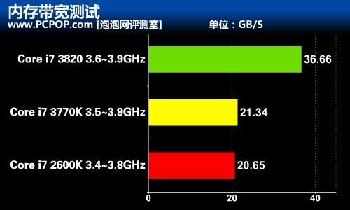 3770K的内存性能与2600K相近,稍有提高,可以看作是工艺改进带来的细微性能进步。而3820的内存带宽则为4通道内存,总带宽自然要高出许多。