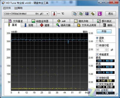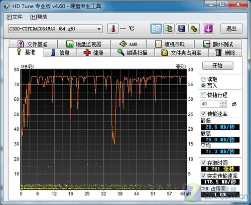 从测试成绩上,我们看出镁光64GB C300[url=]固态硬盘[/url]在SATA 2.0接口上平均读取速度在225MB/S,平均写入速度在71MB/S。而当更换到SATA 3.0接口后,平均读取速度骤然提升至311MB/S,相比SATA 2.0足足提升近90MB/S的速度。不过由于该款固态硬盘写入方面较慢,所以成绩相差不多。