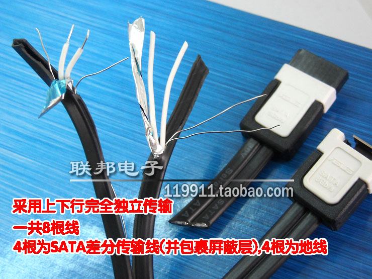 华硕原装6GB数据线均采用独立屏蔽,上行下行独立通道,高速传输是他的强项,内部一共8根线,4根为sata差分传输线(并包裹屏蔽层),4根为地线,保证数据更加稳定的传输。而技嘉等品牌主板自带的sata线为7根线,3条地线,4条sata差分传输线,更有低端线材混排顺序,导致性能急剧下降。