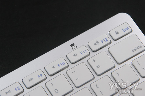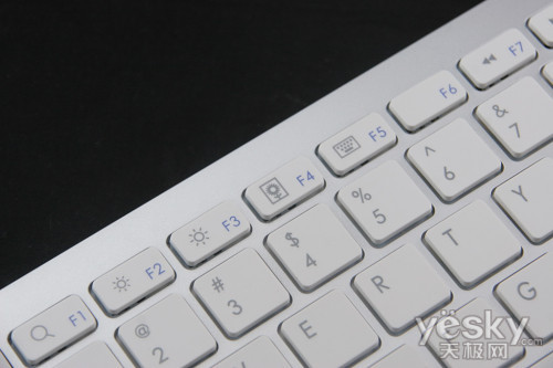 因为这款键盘是对应于苹果产品的,所以他对苹果iOS系统也有相应的支援,而其中最特别的当然就是对应iOS系统的快捷按键。上图顶部按键,从左至右分辨是:HOME(iOS系统非常重要的按键);搜索(这个平时比较少用,不过可以用作搜索邮件之用);亮度调整(一个是调暗,另一个是调亮);在F4位置的是电子相册启动按键,而在F5上面的键盘则是iOS系统的触控键盘切换按键,而这些功能,在连接iOS系统的情况下,都是直接生效的,不需要按住“Fn”键。