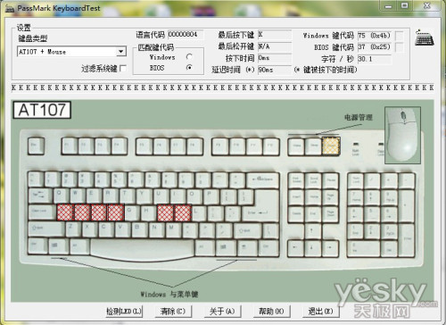 PassMark KeyboardTest共享软件是检测键盘按键功能正常与否的软件,按下按键时,如果按键功能正常,则软件对应的按键位显示红色标识,松开按键则显示绿色(表示有检查)。通过对多个按键的同时按下,测试键盘的同时按下多键数量。