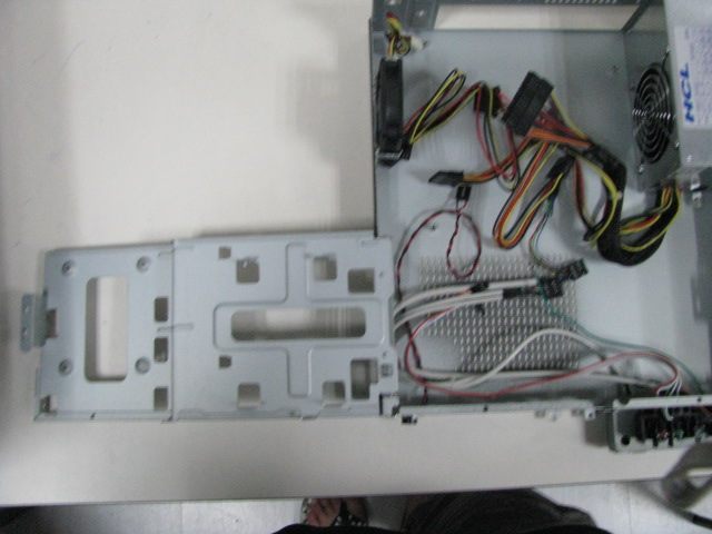 通过图片,可以大致了解下机箱的内部结构。该该机箱有一个3.5硬盘位,以及一个5.25光驱位。软驱位上有4个螺丝孔位,既可以上软驱又可以上2.5的笔记本硬盘(或者SSD)