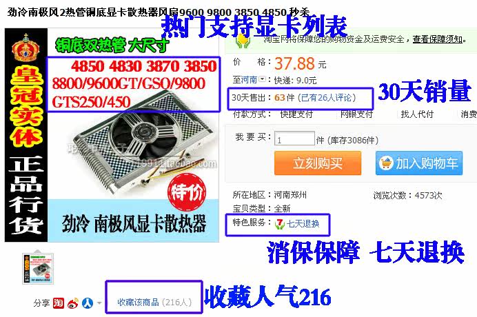 标题: 劲冷捷冷南极风2热管铜底显卡散热器风扇 9600 9800 3850 4850 绝配,只卖34元。。。