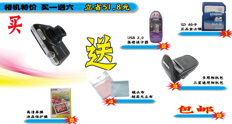 促销活动:399元套餐:标配+相机包+擦拭布+屏幕膜+读卡器+4GB内存卡.(另外拍套餐送Q币或话费,机会不要错过哦!!)
