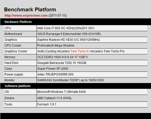 测试平台如上表所示,选用的[url=]显卡[/url]是蓝宝石HD 5830 Xtreme,之所以选它是因为它所用的是Twin Turbo Pro所支持的53*53mm孔距,而且在之前的测试中它满载的温度高达90度,而且本次测试更是将其超频至960/1260MHz以产生更强的热量,测试时装上了两个[url=]散热器[/url]所附属的[url=]内存[/url]散热片,[url=]机箱[/url]使用的是振华SF-2000,还在显卡的Mosfet背部的PCB上贴有温度探头,监测PCB的温度,使用Furmark使显卡满载。