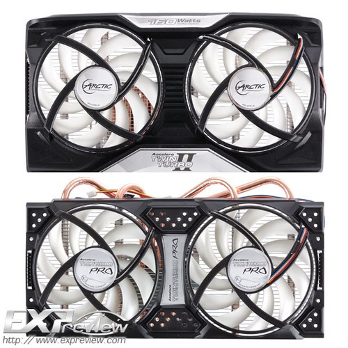而AC在上个月发表了它的升级版——Twin Turbo II,官方称新版[url=]散热器[/url]冷却能力从120W提升到160W,散热性能有了不少提升,此外更重要的是Twin Turbo II提供58*58mm和51*61mm这两种孔距的支持,这两种分别是采用GF100/110和GF104/114核心显卡所用散热器的孔距,这代表着市场上大量的GTX 580/570/560/480/470/460系列显卡都可以用上这个Twin Turbo II了。