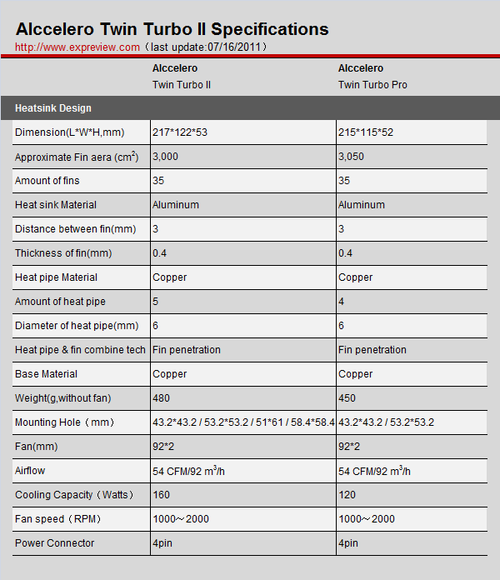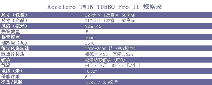 Twin Turbo II与Twin Turbo Pro参数对比 从上面的表格中可以看到Twin Turbo II的体积是要比Twin Turbo Pro要大的,重量也大一点,多了一根热管,不过散热面积比Twin Turbo Pro略小,而所搭配的风扇是完全相同的。