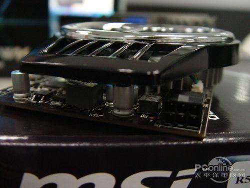 微星 R5750 暴雪-PM2D512M显卡采用的铝制散热器中心加入了大直径铜柱,有助于快速降低核心温度。配合流线型风扇罩设计的大口径风扇,提供了足够的风量,应对40nm核心本来就不高的发热量绰绰有余。