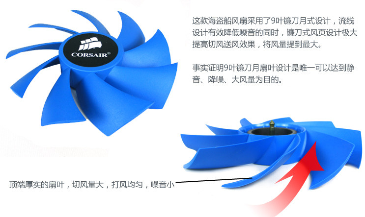 这批风扇是给海盗船的高级机箱而精制的9叶极静音风扇,1700转,24db噪音值,完全听不到在转动的声音。此款机箱是海盗船的顶级机箱,中关村报价2399元。呵呵