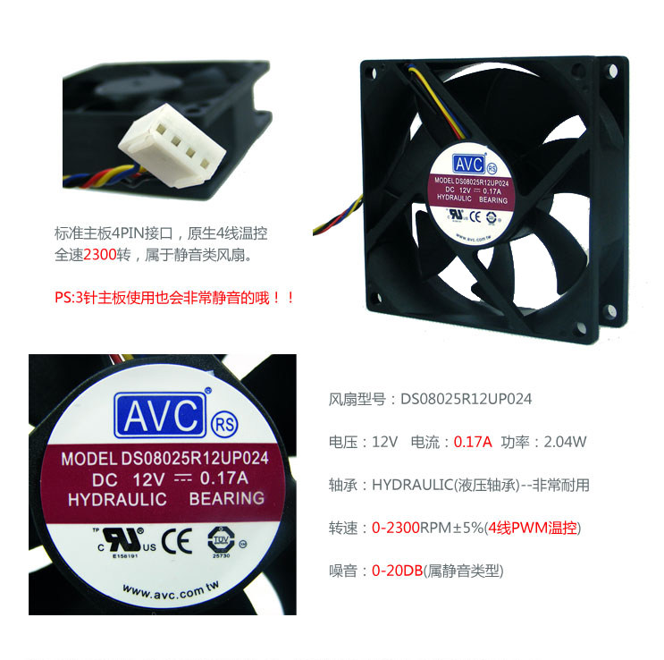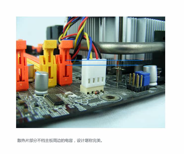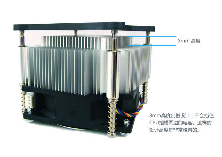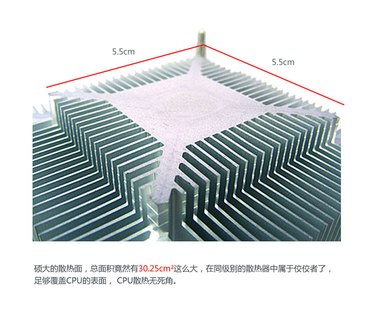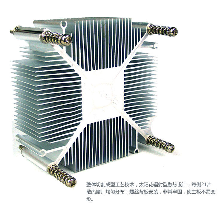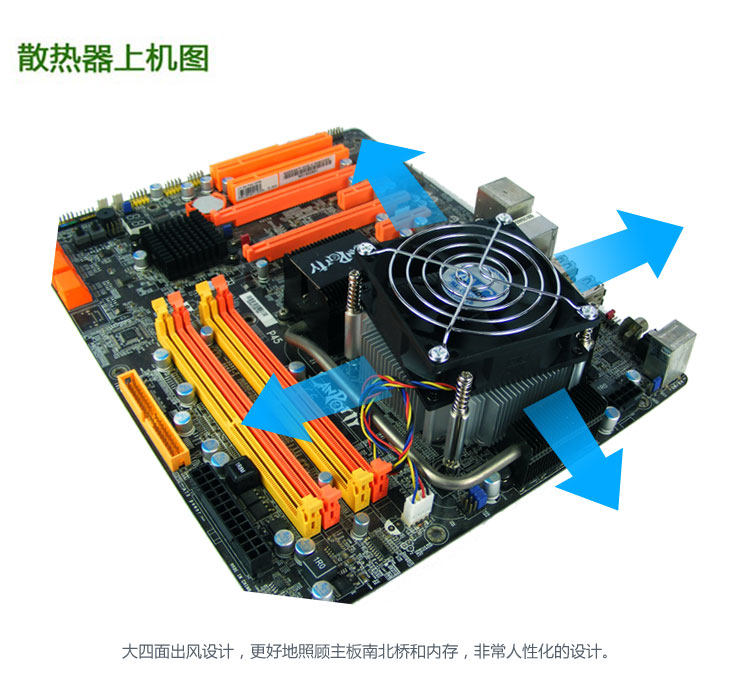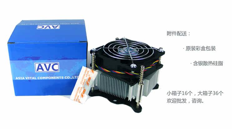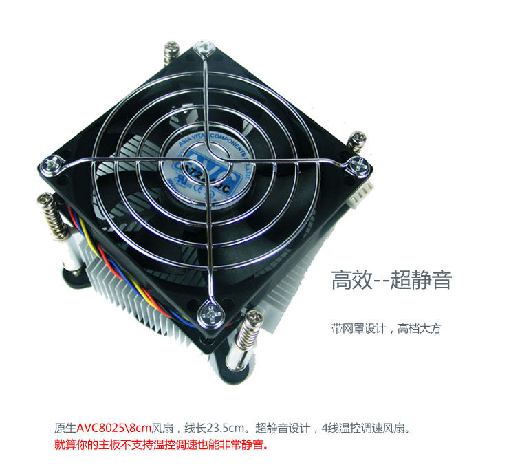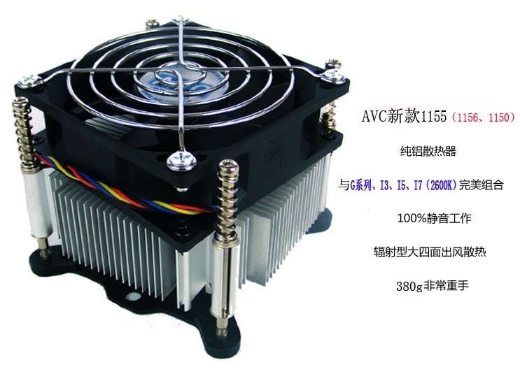 AVC新款1155(1156)纯铝散热器,4线原装AVC8025(带网)风扇,静音工作,配合四面出风纯铝散热片,相得益彰,风扇是4针温控风扇,就算主板不开启温控调速功能,都能非常的静音。