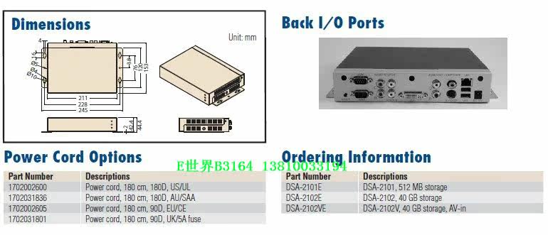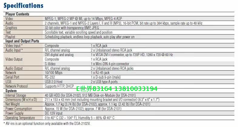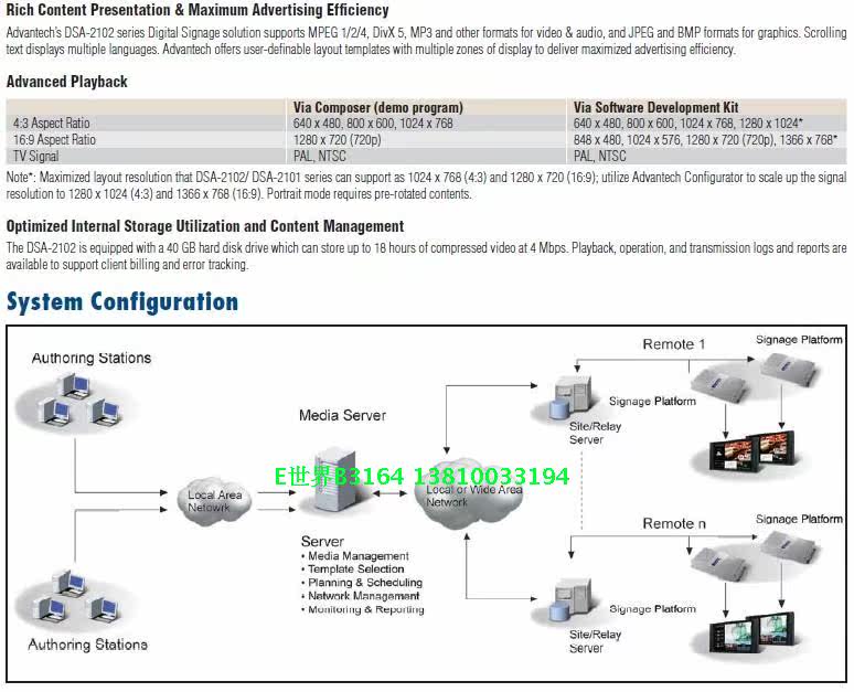 研华DSA-2100是一款数字播放器,它从IP网络上接受相关视频、音频、图形或文本数据后,将之保存到本地硬盘上,然后,可根据预定义的播放列表或网络控制命令来播放相关内容。DSA-2100拥有最先进的音频/视频解压和图形处理能力,它可输出数字和模拟信号,可用于调制解调器;等离子显示器、LCD显示器及数字投影仪等高分辨率设备。它是一款用于广告、演示、培训等场景的理想播放器。