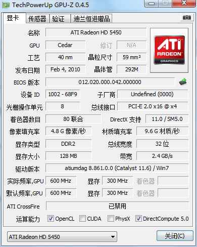 你的5450 80SP 600/300的频率,128MB显存带宽32bit