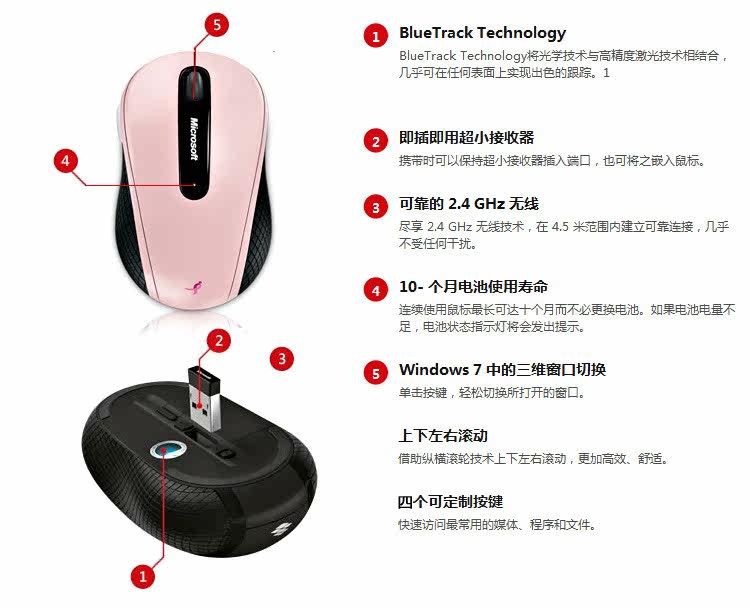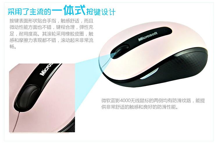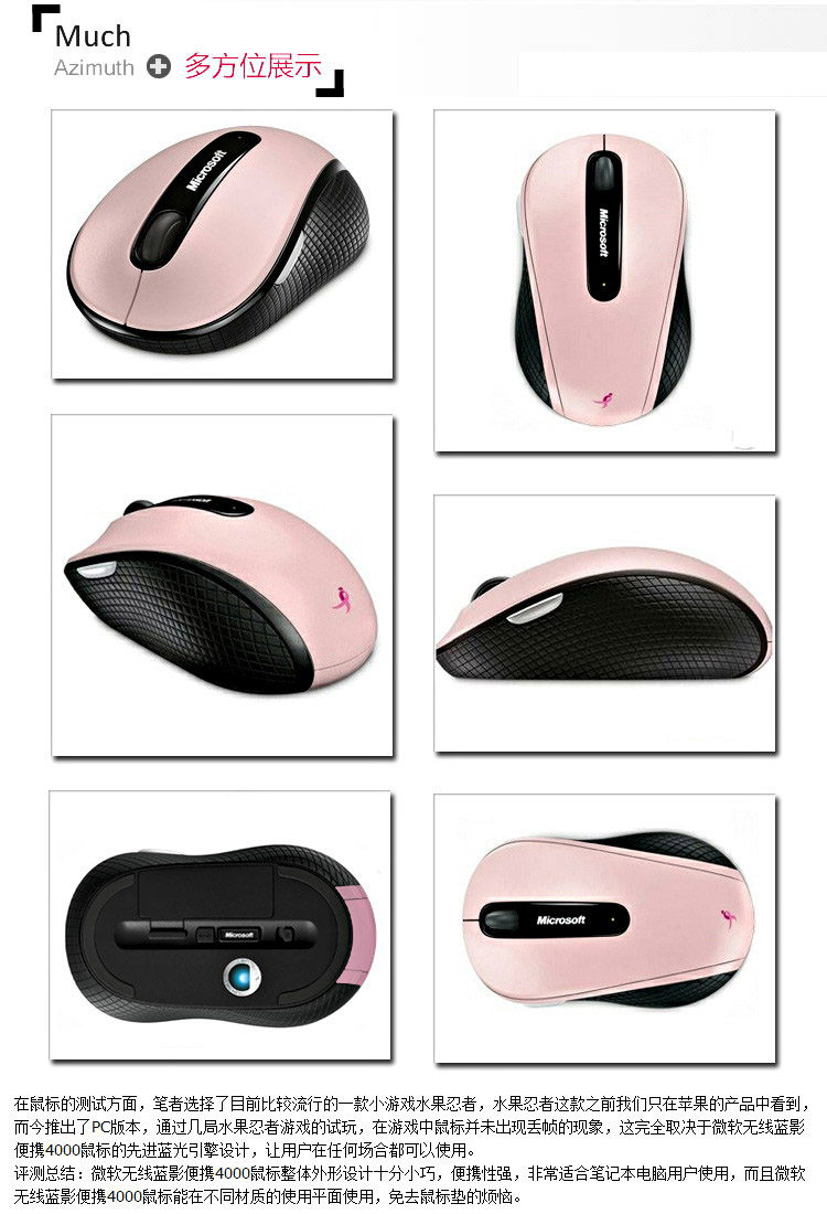 这批货的是微软为赞助国际乳癌防治月定制的一款无线鼠标,原型是微软的一款名为Wireless Mobile Mouse 4000(中文名:无线便携蓝影4000)的鼠标,采用的是2.4G无线技术,有效工作半径为4.5米(为提高续航时间降低了发射功率的设计是明智的),相信这个距离已经满足绝大部分笔记本用户的需求了。当然接台式机使用也可以。定制版比普通版多了一个粉红色的乳癌防治标志,女性朋友应该很熟悉!男同胞们不知道?问度娘长见识。