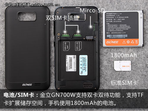 金立GN700W风华提供WCDMA/GSM双网双待功能,可以享受WCDMA 3G高速网络同时无需放弃就有的GSM号码,这个设计更贴合商务人士使用习惯,手机提供有TF卡插槽,可以扩展手机的储存空间,1800mAh[url=]电池[/url]更可提供持久的续航时间。