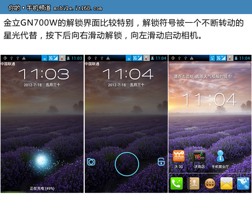 金立GN700W风华的解锁界面设计比较特别,解锁符号被一个不断活动的星光符号代替,按下后向右滑动就可以实现解锁功能,向左滑动可以快速启动相机。