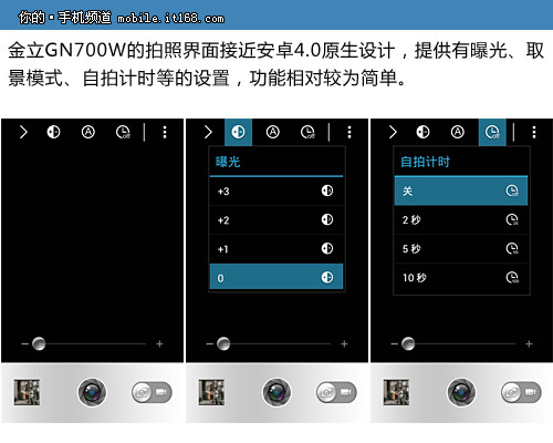 金立GN700W风华的拍摄界面相对比较简单,接近安卓4.0的原生拍摄界面,在界面的上方可以对相机进行各种设置。