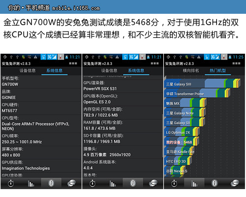 金立GN700W风华的安兔兔测试得分为5468分,分数对于1GHz的算好智能[url=]手机[/url]算是不错了,在众多对比智能[url=]手机[/url]中属于中上游位置。