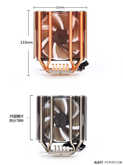 说到全球最顶级散热器自然而然就会想到那些采用“双塔”结构设计的产品,利民的银箭、[url=]猫头鹰[/url]的HN-D14、采融的Megahalems这些都是大名鼎鼎的顶级风冷散热器,这种独特结构优化气流运动更适合目前主流热管+鳍片的组合方式。其实不仅仅是高端才有双塔结构,早在数年前,全球顶级散热器品牌[url=]AVC[/url]就曾经推出过一款中端双塔散热器——拿破仑。拿破仑在当时以良好的[url=]散热[/url]能力和出色的性价比成为[url=]DIY[/url]玩家心中无可替代的选择,至今依然有不少朋友舍不得换掉。 可惜的是近些年双塔结构只出现在旗舰级产品上,售价大多在三四百元以上,对于大部分DIY用户来说价格太高不能承受。近期,国内著名散热品牌[url=]超频三[/url]发布了一款面向中高端用户的双塔散热器——铁塔豪华版,该产品官方报价199元,相信实际成交价格要低一些,主要面向中高端DIY用户,可以用较低价格购买到双塔结构的产品,确实很诱人。[url=] 铁塔豪华版散热器有两种款式,一种是表面完全经过镀镍处理的,另一种是经过完全镀铜处理,的镀镍很常见,抗氧化加强鳍片硬度是优点,其实镀铜也有同样的作用,颜色不同质感也不大一样,可以满足不同消费者的喜好。该产品尺寸中等偏大,重量为465g,控制在了0.5kg以内就算不上[url=]主板[/url]杀手,可以放心的用在各种等级的平台上。 铁塔豪华版外观简介刚才跟大家说到铁塔豪华版有镀铜和镀镍两种,至于内部结构、外观设计、附件扣具等等除了颜色以外没有任何区别,甚至重量也相当。所以之后我们的照片会将两款产品以相同角度同时展出,不做过多重复。 初次看到铁塔豪华版的时候总觉的很眼熟,是不是和去年年末推出的[url=]南海6[/url]非常相似呢,而且结构也同样是双塔+中置风扇的设计,只不过尺寸略微缩小了一号,当然很多细节是不一样的,比如鳍片的边缘纹路等等,只是理念相同。 [url=] 侧面 宽度为68mm,基本上不会对[url=]内存[/url]或北桥散热片构成威胁,这就是为什么塔式散热器比下压式散热器更流行的原因之一,当然还有效能等重要因素。 [url=] 鳍片间隙均匀 鳍片间隙均匀大约在1.5mm左右,由于经过镀铜和镀镍处理,鳍片比一般单纯的铝片硬度要高,不容易因为运输而损坏。值得注意的是,一般39层鳍片也就意味着有39叶,而双塔结构两侧鳍片相对独立,所以应该×2,以供有78页,不过表面积并没有增加。 [url=] 它们附带了相同配件 支持目前主流CPU[url=]处理器[/url],兼容性很好,采用了超频三自主研制的全平台扣具,安装比较紧密不会出现松动,也不会对[url=]主板[/url]造成伤害,就是安装的时候有点复杂,对于新手来说最好按照说明书指示完成。除了必要配件外,还提供了八个风扇固定胶钉,以后扩展风扇不用在单独添加。 近距观赏铁塔豪华版作为国内数一数二的散热器品牌,超频三散热器产品的品控及工艺非常好,从细节就能看出来。下面我们从导风罩、热管连接及底座等三个方面介绍铁塔豪华版。 [url=] 导风罩 导风罩并不是所有散热器都配备,它的作用是收集风力让其尽量集中的流经鳍片表面以减少损耗,其实风扇边框也有类似作用。对于双塔散热器来说不仅需要利用出风,吸风环节也同样重要,所以导风罩的效果很明显。铁塔豪华版的导风罩沿袭了[url=]南海6[/url]的优势,不仅外观设计漂亮线条流畅有很好的装饰效果,密闭性也很出色。此外,在导风罩边缘还有两个小箭头,用来指示风向,非常贴心。 [url=] 热管与鳍片 热管和鳍片采用FIN工艺穿接在一起,塔式热管散热器中经常见到的一种工艺,比焊接工艺简单成功率高,易于控制,效能也不错成本相对低廉。从几十元到几百元的产品都能见到这种工艺。 [url=] 底座 底座处理一直是国内散热器厂商相对薄弱的一个环节,不过这款产品的处理看上去比较得当,底面接触CPU表面的部分均采用纯铜,热管也是铜的,两种相同材质导热效果更好。镀层的处理比较理想,可以当镜面使用,较为平整。 风扇与导风罩一款散热器最和主要的部分是散热片没错的,但是风扇也同样重要,因为风扇是散热器噪音的来源,也是产品散热能力的重要保障,直接影响消费者对产品的喜恶感。 [url=] 铁塔至尊版的风扇隐藏在鳍片中间 [url=] 导风罩很漂亮 [url=] 4pin PWM调速风扇 [url=] 风扇及参数 [url=] 蓝色[url=]LED[/url]风扇 铁塔豪华版采用了10cm风扇,扇叶采用磨砂质感黑色半透明塑料制作,内置了蓝光LED灯,开启平台后会点亮,由于本身风扇是黑色半透明的再加上隐藏在鳍片中间,所有这种蓝色灯光幽静而不刺眼,恰到好处。该风扇是由超频三自行研发并生产制造的。 “双塔”式结构 一直再说这款散热器采用双塔式结构,那么究竟双塔式结构是什么意思?它的好处又在那里呢?别着急,我们现在就来了解一下。 [url=] 镀镍板散热片部分 [url=] 镀铜版散热片部分 [url=] 双塔结构的要点在于鳍片分离 其实双塔结构只是一种比较笼统的称谓,其要点在于鳍片相对独立,铁塔豪华版是非常标准的双塔,相对独立的散热片一左一右分列在两侧。为什么要选择双塔结构?如果抛开风扇的作用不谈,单纯的单塔和双塔结构在用料相同散热面积相同的情况下区别不大。也就是说双塔结构正真优化的是气流作用。 [url=] 侧面 普通的塔式散热器风扇都是向着散热片吹气,虽然鳍片留有间隙但是或多或少都会阻挡气流通常,这时风扇入风