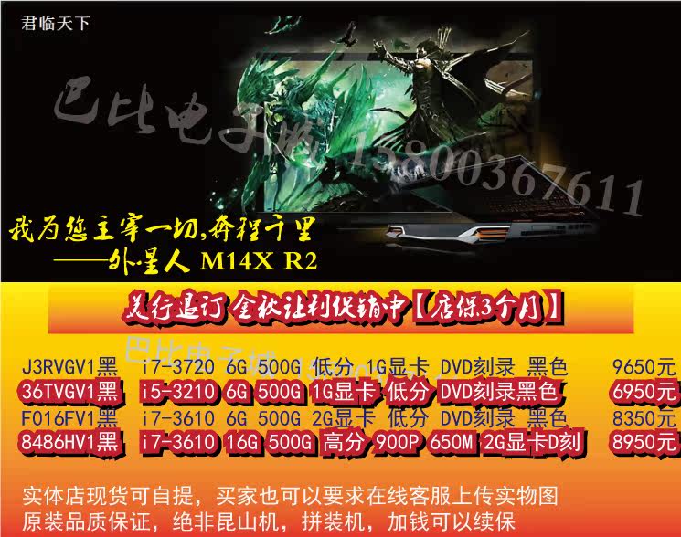 M14X R2 美行退订 国内现货!!高配M14X I7-3610M/6G 1600内存/500G 7200转/ GT650M 1G显卡/1600X900 屏幕/蓝牙无线镜头 店铺保修3个月=9950.00【现货大陆无包装】