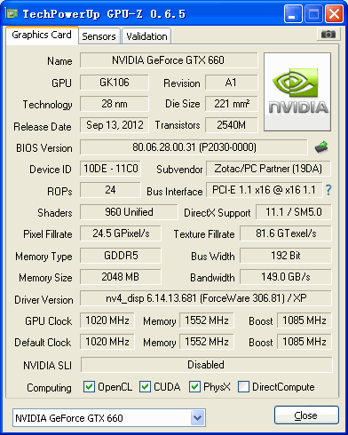 核心:GK106,28nm,基础频率1020MHz,动态提升频率1085MHz,流处理器:960个