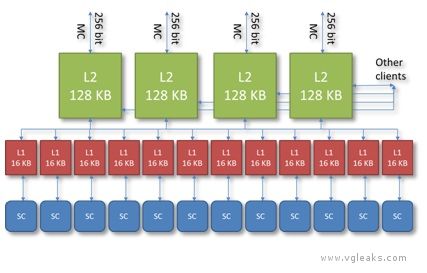 The GPU also contains a single 64-KB buffer of global shared memory (GSM). The GSM contains temporary data referenced by an entire draw call. It is also used implicitly to enforce synchronization barriers, and to properly order accesses to Direct3D 11 append and consume buffers. The GSM is capable of acting as a destination for shader export, so the driver can choose to locate small render targets there for efficiency. CacheDurango has a two stage caching system, depicted below. L2 CacheThe GPU contains four separate 8-way L2 caches of 128 KB, each composed of 2048 64-byte cache lines. Each L2 cache owns a certain subset of address space. Texture tiling patterns are chosen to ensure all four caches are equally utilized. The L2 generally acts as a write-back cache—when the GPU modifies data in a cache line, the modifications are not written back to main memory until the cache line is evicted. The L2 cache mediates virtually all memory access across the entire chip, and supplies a variety of types of data, including shader code, constants, textures, vertices, etc., coming either from main RAM or from ESRAM. Shader atomic operations are implemented in the L2 cache. L1 CacheEach shader core has a local 64-way L1 cache of 16 KB, composed of 256 64-byte cache lines. The L1 generally acts as a write-through cache—when the SC modifies data in the cache, the modifications are pushed back to L2 without waiting until the cache line is evicted. The L1 cache is used exclusively for data read and written by shaders and is dedicated to coalescing memory requests over the lifetime of a single vector. Even this limited sort of caching is important, since memory accesses tend to be very spatially coherent, both within one thread and across neighboring threads.