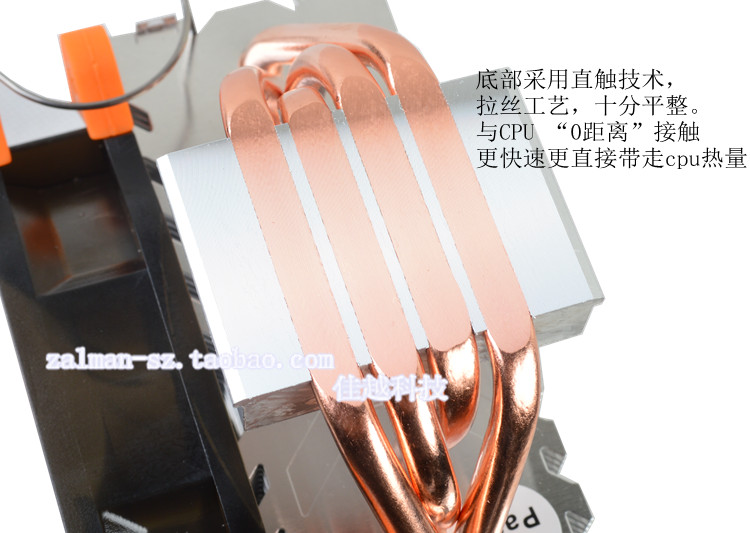 宇袥中央峰散热器底部采用普通热管直触工艺,文雅:热管直接工艺可以在成本与性能之间取得一个平衡点。[url=]