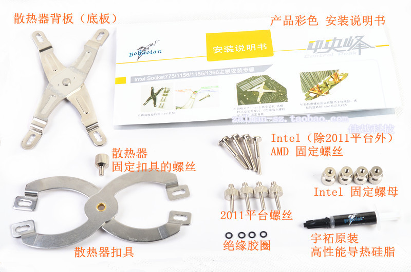 1.中央峰散热器的扣具1副。用于装第二个风扇(双风扇)
