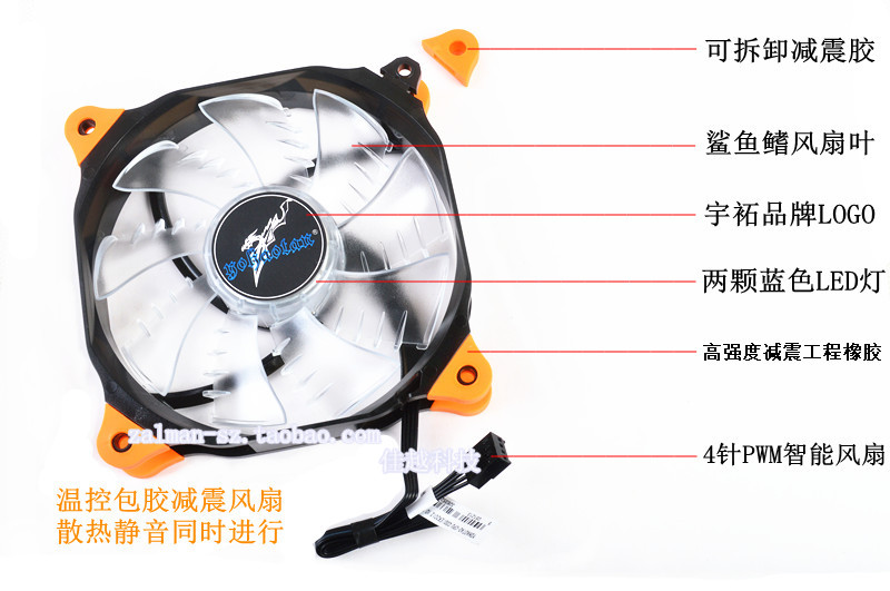 该散热器标配了一颗12025风扇,基本是第一眼看到该风扇的读者都会觉得外观设计很不错,是的,据厂商透露,该款风扇前后修改10来次之后最终才有它的出现,并且后续还会有其他颜色可选。整体上该风扇采用透明黑框安装孔位处包上橙色的减震胶圈,透明扇叶以及剑齿状叶片设计,工作时中心发出蓝色LED光,风扇接口采用4Pin PWM,支持温控功能。