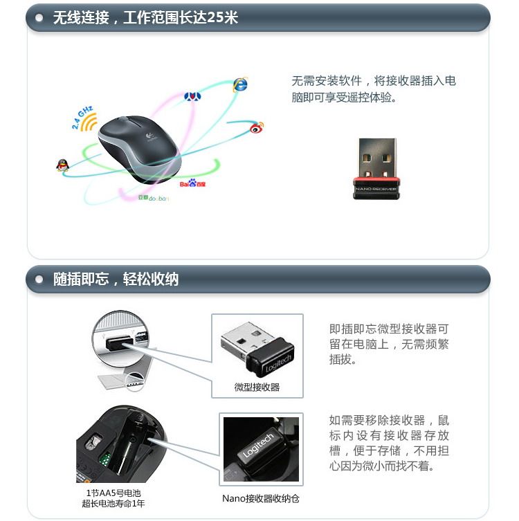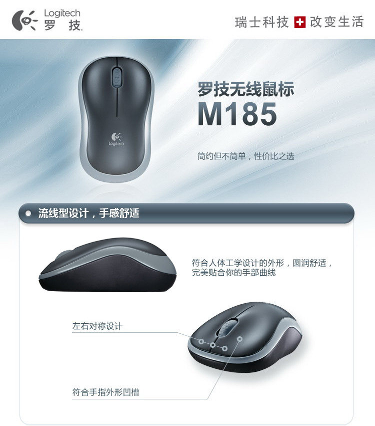 本店力求介绍图文详实,内容丰富,优点、不足都会提到,不看是您的损失哦~ 因为是罗技在售型号(非停产),所以很容易找到官方的介绍。下面就以官方的介绍作为开篇,M185作为罗技的入门级无线鼠标,确实做到了简约而不简单,支持SetPoint软件,支持优联技术,这些技术特性在入门级产品中非常少见。加上官方¥79的终端定价,使得M185成为名副其实的性价比之选。如果您只是上网、办公常规鼠标操作,而不是激烈游戏用,这款绝对是获得“无线自由”的首选。