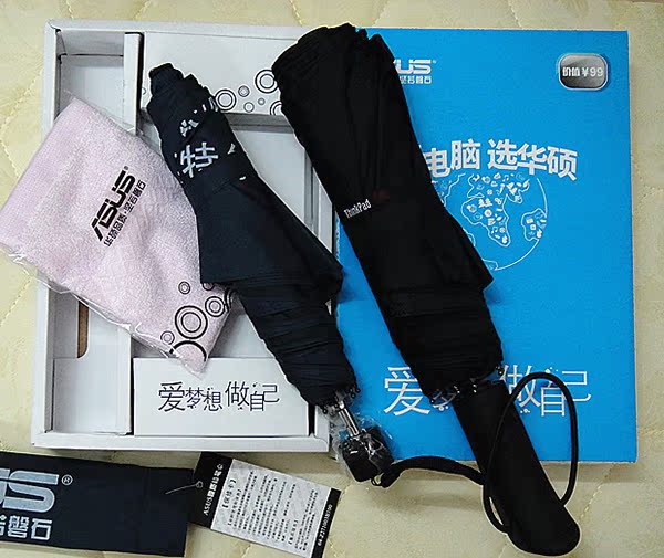 这款礼品套装华硕标价99元,这款伞是铅笔伞,非常小巧,做工精细。收起后长度是可以随意放入公文包和电脑包中。毛巾为竹炭纤维毛巾,也是很小巧的,出差用很合适。 | |