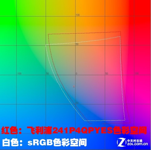 接下来,我们要做的是使用Spyder Elite 3校色仪来制作出这款机型的原始icc文件,并将其进行分析得出飞利浦241P4QPYES的色彩特性表现。下面图片中白色的闭合曲线代表sRGB色彩空间,红色的闭合曲线代表飞利浦241P4QPYES色彩空间。