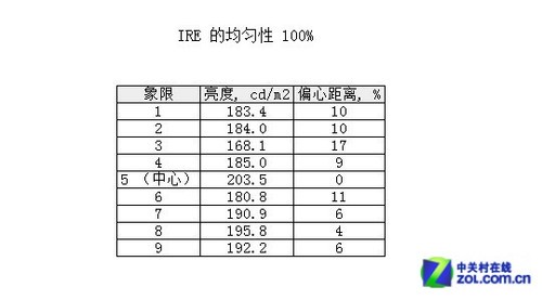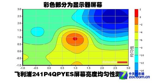 (红色部分亮度较高,蓝色部分说明亮度较低) 通过上图,我们可以看到飞利浦241P4QPYES屏幕中心处的亮度是最高的,数值为203.5cd/m2,而其整个屏幕右上角除部分区域的亮度相对最低,数值180.8cd/m2。此外,飞利浦241P4QPYES的显示屏幕整体上而言,均匀性表现处于中上等的水平。