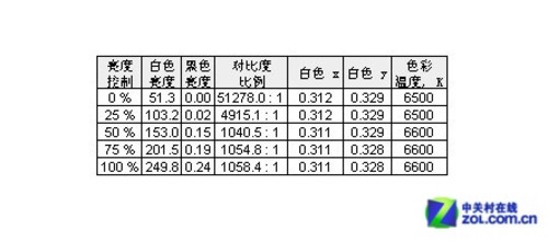 接下来,我们进行的是另外一个新项目:色温一致性的测试。这个测试的目的是考验[url=]显示器[/url][url=]产品[/url]在不同亮度下白点色温的稳定性,毕竟用户会随时调节显示器的亮度,此时对比度和色温不应该发生太大的变化。我们分别将飞利浦241P4QPYES的屏幕亮度调节到0、25、50、75和100,测试亮度和全黑时亮度以及色度坐标,计算出对比度以及色温值。各个亮度下色温值和对比度比值不发生变化是最为理想的。
