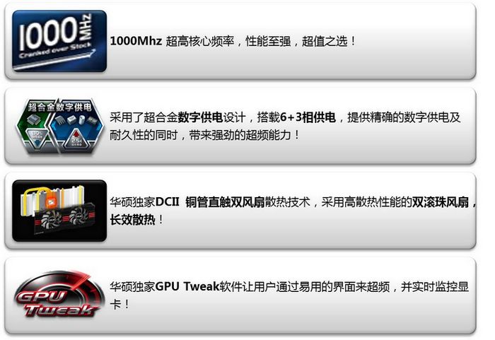 ![]() | 【智能操作,全面提速】 正如好车要有智能的人机交互系统一样,一款优秀的独立游戏显卡,除了硬件构造以外,能够全面控制和调校显卡的各项参数,具备丰富而实用的功能性软件也是必不可少的。华硕专为玩家量身打造GPU Tweak智能显卡软件,可监测显卡运行并实时调节各项参数,内嵌最权威的显卡检测工具GPU-Z,自动更新驱动和刷新BIOS,最高支持四卡交火同时进行参数调节。同时,游戏玩家还可通过GPU Tweak调节键盘、鼠标的灵敏度,以及录制游戏视频分享给好友。 |