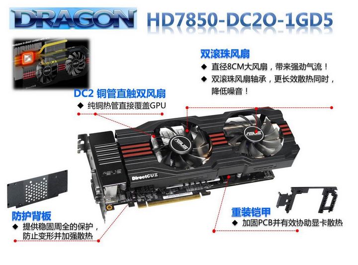 ![]() | 【高效散热,强劲冷静】 独立游戏显卡属于精密的电子设备,它所采用的元件在高温环境下会快速发生老化并进而影响到使用寿命。因此对于显卡来说,尽可能低的工作温度不仅可以提高工作稳定性,还可以大幅延长显卡的使用寿命。华硕游戏显卡采用独家DirectCU热管直触式散热技术,高纯度铜质热管直接贴合发热源——GPU核心,0距离传导快速带走核心热量,热量通过大面积的散热片挥发出去,可提升显卡散热效能20% 。 |