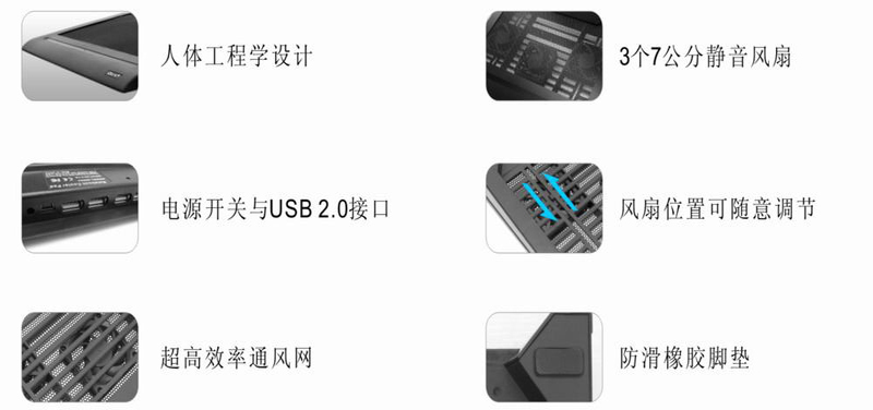 用全新自然坡度的人体工学设计,使用时更加舒适;创新独特的流线造型,时尚美观;底部渐开式风道设计,为你笔记本提供更好的散热;独创风流通道 流动冷却可移动风扇,重点散热; 配备3个低转速静音风扇,2个吹风,1个吸风,建立风流通道;适用光驱设置于各方向的笔记本电脑,适用于市面上主流笔记本电脑.独特流线造型,人体工学设计;超大金属格栅,全面提高散热;3个高效风扇,流动重点冷却;2个吹1个吸,独创风流通道。 | |
