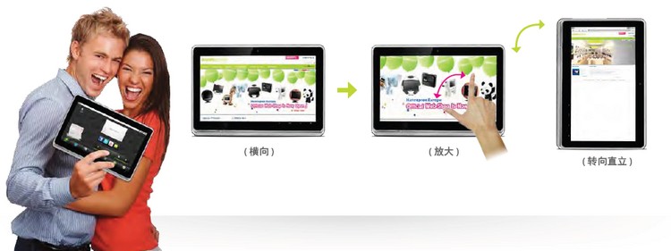 ![]() | 网页浏览 HANNSpad 的10.1 英寸宽屏触控面板让您更方便的浏览网页的全貌,一览无余。您在观看肖像照片和风 景图片时,屏幕可自动感应改变显示方向,超高规格,最新的处理器和Flash 10.1,可使得图像更清晰精 彩,让您在阅读和享受视频的时候不会错过任何细节。 手指轻轻一触,即可浏览网页 通过 2 个手指沿着垂直和水平的方向上下或左右滑动。即可放大缩小网页,让你阅读更轻松畅快。 |