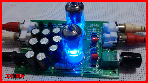 3.板上设计的音量控制电位器,电源开关,电源输入接口,音频输入和输出接口,使用直分方便,电子管底部安装有蓝色LED,工作时发出蓝光,十分迷人。