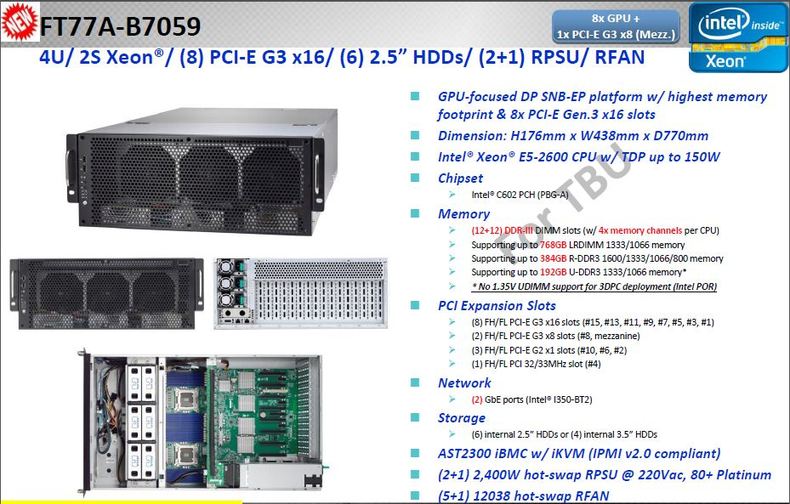 特性 4U机箱支持8个Nvidia Tesla K20/K20X GPU,提供高达21,504 CUDA 核、31.6 Teraflops 单精度和10.56Teraflops双精度浮点性能。 支持动态并行功能,GPU线程可自动产生新线程,大大简化了并行编程,GPU加速器可应用于更广泛的算法,例如自适应网络(AMR)、快速多极子算法(FMM)和多重格网算法。