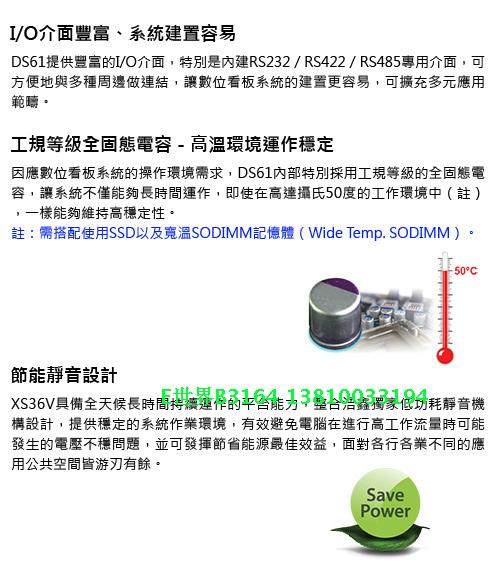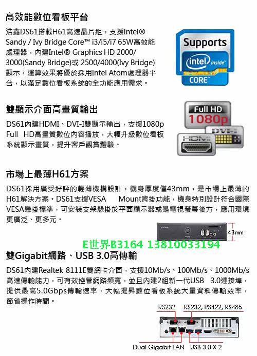 BACK PANEL | (2) RJ45 Gigabit LAN port (1) DVI-I port (1) HDMI port (2) USB 3.0 ports (1) RS232 (1) RS232/RS422/RS485 (1) External power on header (1) DC in (1) Kensinton lock (2) Wireless Antenna fixture |