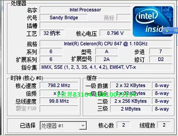 这款赛扬847最新处理器采用了上一代SNB架构,双核双线程,主频为1.1GHZ,TDP 只有17W,实际工作电压只有0.5V左右,从而使处理器的工作温度极低。