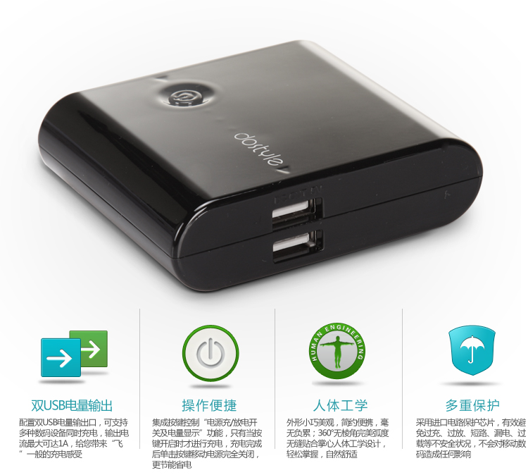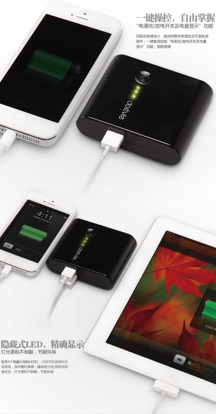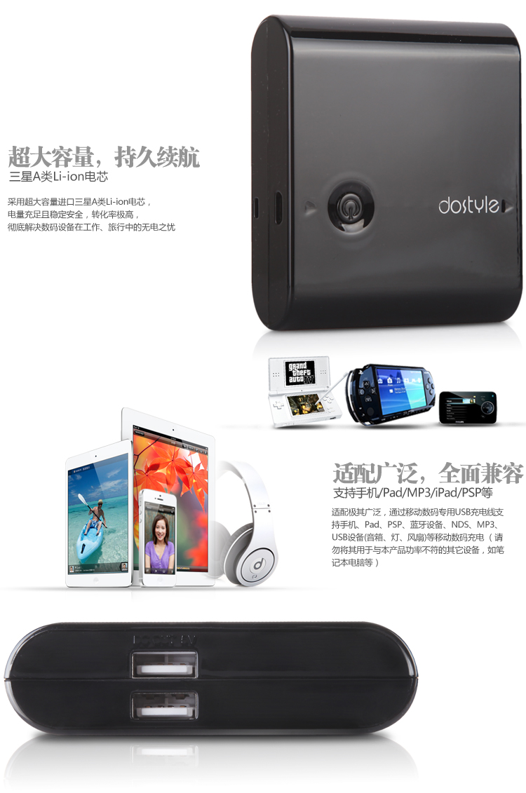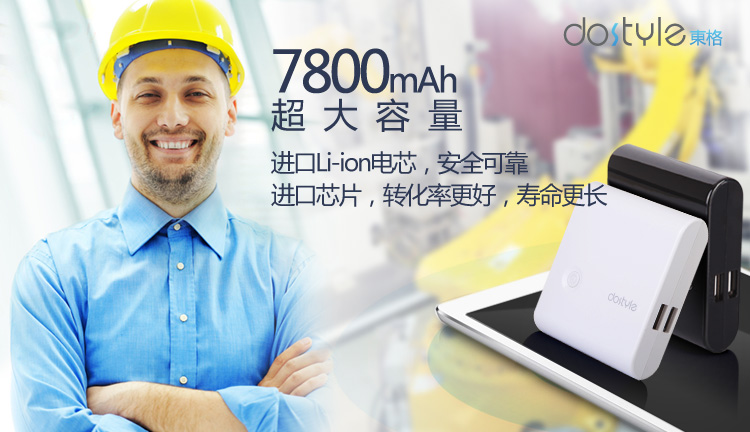 東格(dostyle)SP101移动电源采用三星Li-ion电芯,电能强劲。7800mAh超大容量为您的数码设备(iPhone/iPad/iPad2/PSP/MP3等)提供持久的续航能力,保证您的生活、工作、旅行不断点(电)。