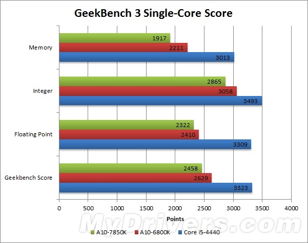 比较遗憾的是单线程性能方面,Kaveri APU的顶级型号A10-7850K相对A10-6800K来说居然出现了一定的下降,虽然幅度不足10%,但依然令人费解,毕竟多线程性能增加了,但单线程居然会下降,AMD掌握了黑科技?