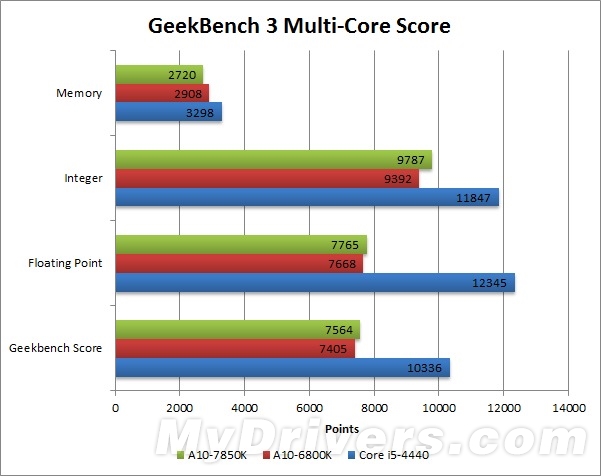 多线程性能测试中尽管Kaveri APU的核心频率有所下降,但相对A10-6800K来说依然取得了小幅度的提升,看来所谓的压路机架构确实得到了一定的优化,不过面对i5-4440的差距依然非常大。