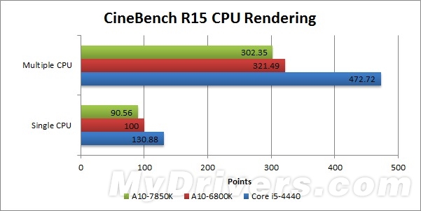 CineBench R15测试中,A10-7850K相对A10-6800K来说性能居然出现了一定程度的下滑,面对i5-4440的劣势更大了。