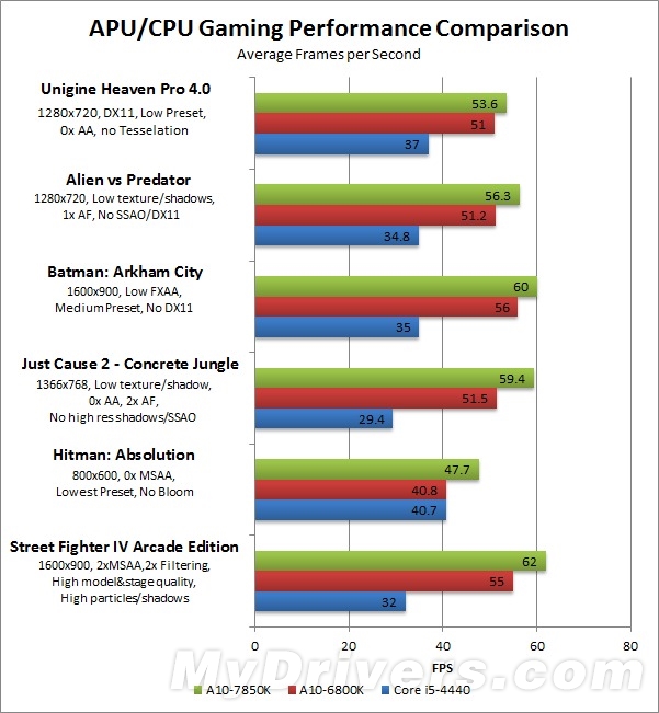游戏性能测试中,孱弱的i5-4440我们就抛开不提了,对比A10-7850K以及A0-6800K来看的话游戏性能确实有了一定的提升,平均幅度大约在10%到15%之间。但在Unigine Heaven Pro 4.0测试中A1-7850K的表现比较令人失望,相比A10-6800K仅提升了不到3帧。