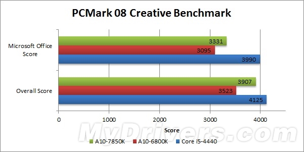 PCMark 8测试中i5-4440大幅度领先于APU,但A10-7850K相对A10-6800K的提升也比较明显,缩小了和i5-4440的差距。