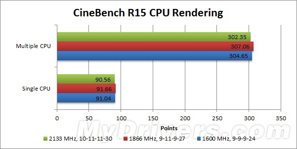 CineBench R15测试中,使用2133内存的时候,分数比用1600的还差。
