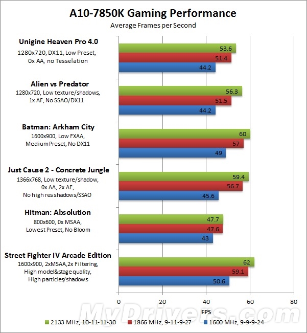 从内存频率对比来看,DDR3-1600MHz内存依然无法激发Kaveri APU的性能,只有DDR3-1866MHz以上才符合 要求。